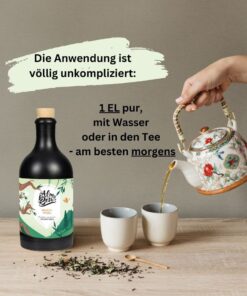 Du kannst ihn pur einnehmen, in ein Glas Wasser rühren oder in deinen Tee geben. Wichtig ist: nicht in heißes Wasser, damit die wertvollen Inhaltsstoffe erhalten bleiben. Die meisten nehmen ihn morgens oder wenn sie merken, ihr Körper braucht gerade etwas Unterstützung.